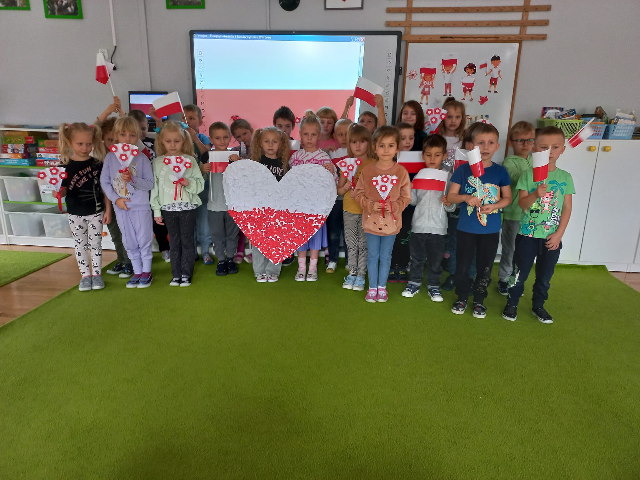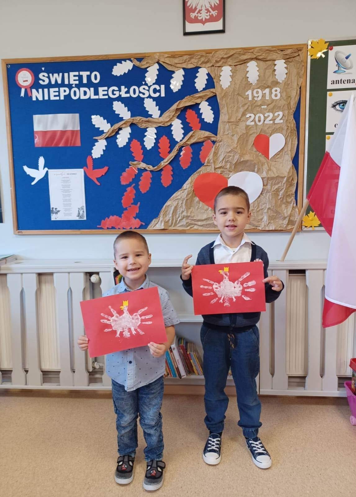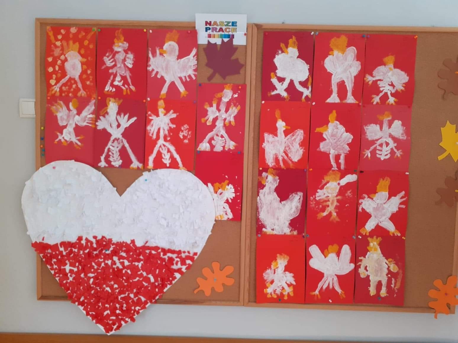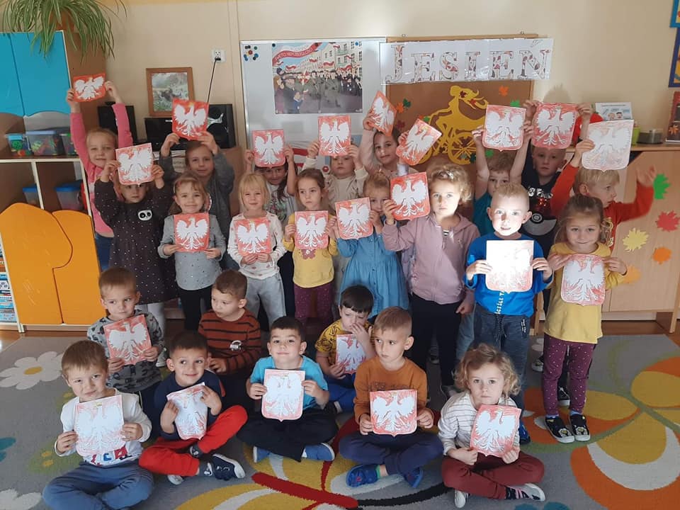 W minionym tygodniu realizowaliśmy tematykę związaną z Polską. Podczas zajęć dzieci wzbogaciły słownictwo o nowe pojęcia związane z poznawaniem swojego kraju, utrwalały nazwy symboli narodowych. Wykorzystując różne techniki plastyczne wykonały prace związane z Polską. Dnia 10 listopada 2022 przyłączyliśmy się do Ogólnopolskiej Akcji „Szkoła do Hymnu”. Jest to akcja ogłoszona przez Ministerstwo Edukacji i Nauki, polegająca na odśpiewaniu hymnu państwowego w dzień poprzedzający Narodowe Święto Niepodległości. Dokładnie o symbolicznej godzinie 11:11 wszyscy uroczyście odśpiewali w swoich grupach hymn narodowy „Mazurka Dąbrowskiego”. Wszyscy pamiętaliśmy tego dnia o uroczystym ubiorze oraz prawidłowej postawie podczas śpiewu. Dzieci z grupy III, IV i V wybrały się też na spacer pod pomnik Józefa Piłsudskiego, aby złożyć hołd wielkiemu Polakowi przed zbliżającym się Świętem Niepodległości.